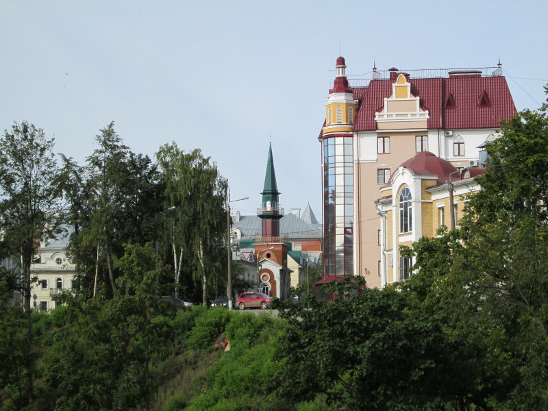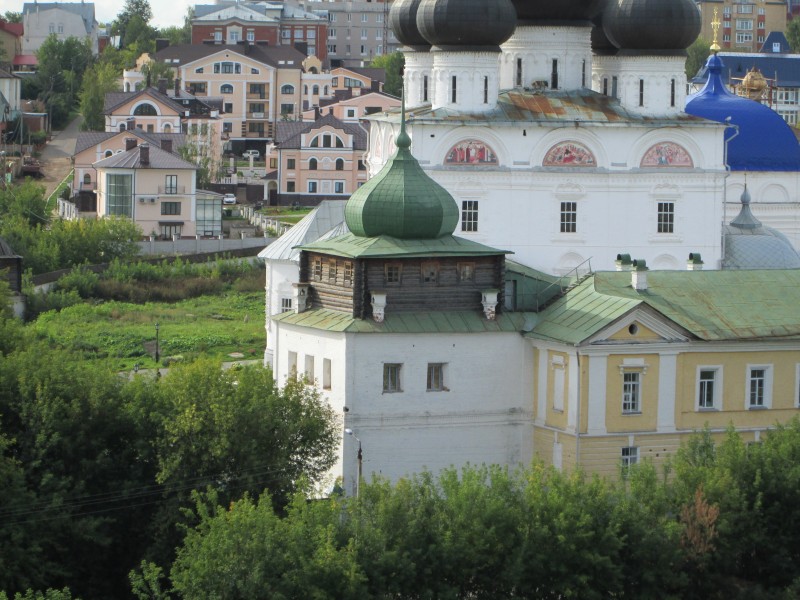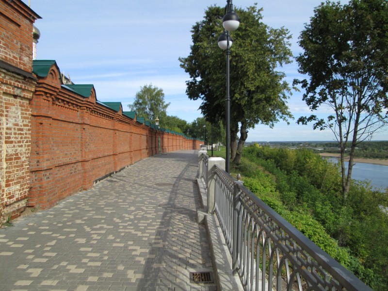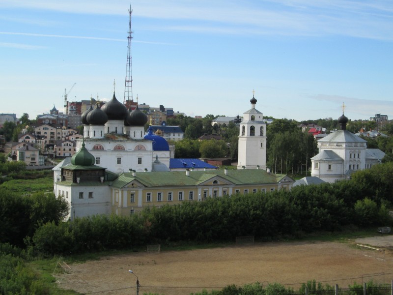 Вид с края набережной: пятиглавый Успенский кафедральный собор, Вятское духовное училище (жёлтое), колокольня, Никольская надвратная церковь (самая правая). Синеет Благовещенская церковь.