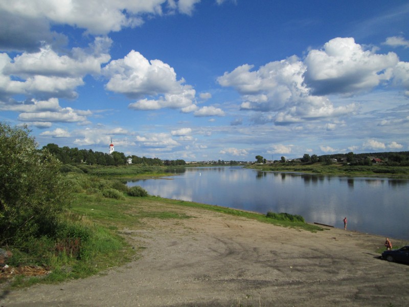 Местный пляж. Два дня был в Тотьме - каждый день купался, благо погода днём была солнечная. Течение хорошее, не выгребаешь,