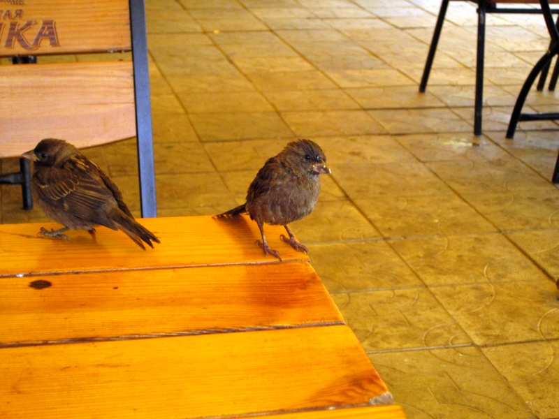 Воробьи там просто наглые - сидят на столе и соседних стульях и в рот заглядывают, протянул в руке кусочек -