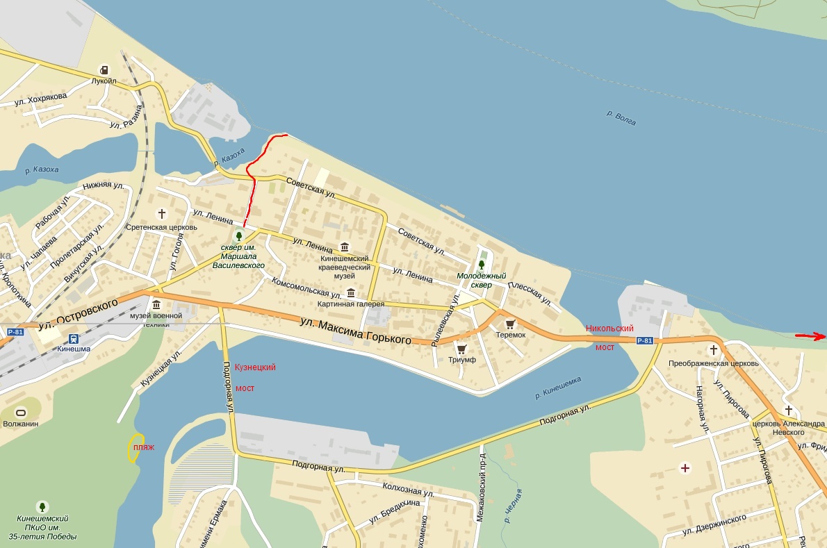 Красная линия - путь от сквера Василевского до р.Казоха и вдоль неё до набережной.