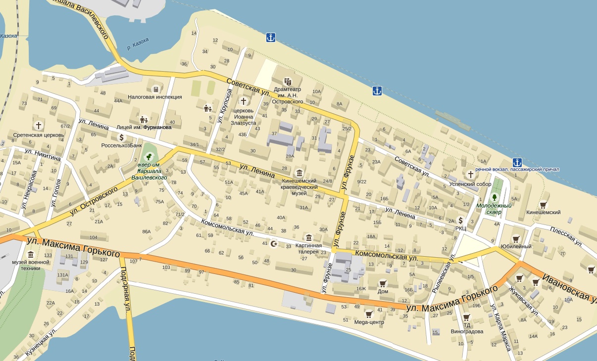 Старинный городок. Первое упоминание в летописях - 1429 год. Статус города Кинешма получила в 1777. Сейчас население 85 тысяч.