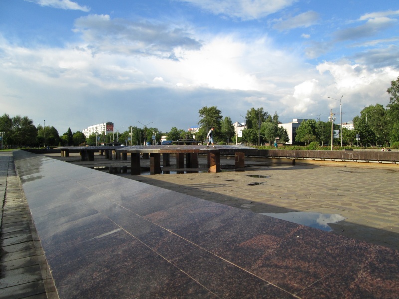 Громадные фонтаны в имперском стиле, облицованные гранитом, около дворца культуры металлургов на улице Сталеваров, которая здесь более похожа на проспект, ибо её ширина около 100 метров.