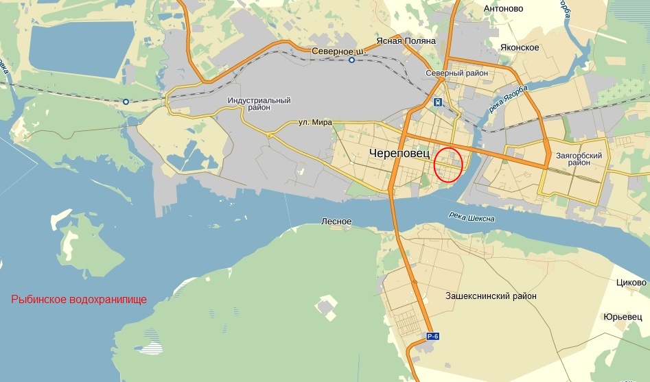 Стоит у впадения реки Ягорбы в Шексну. Старый город выделен красным овалом.