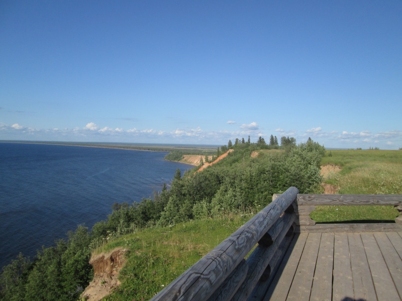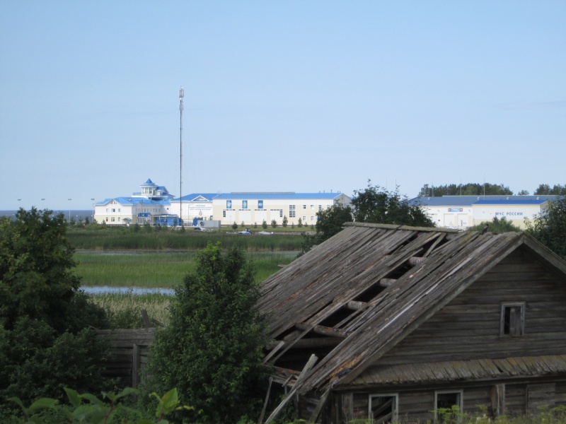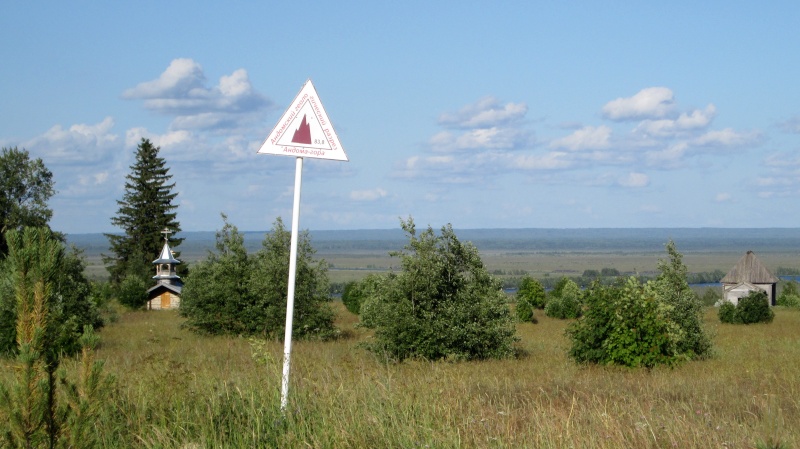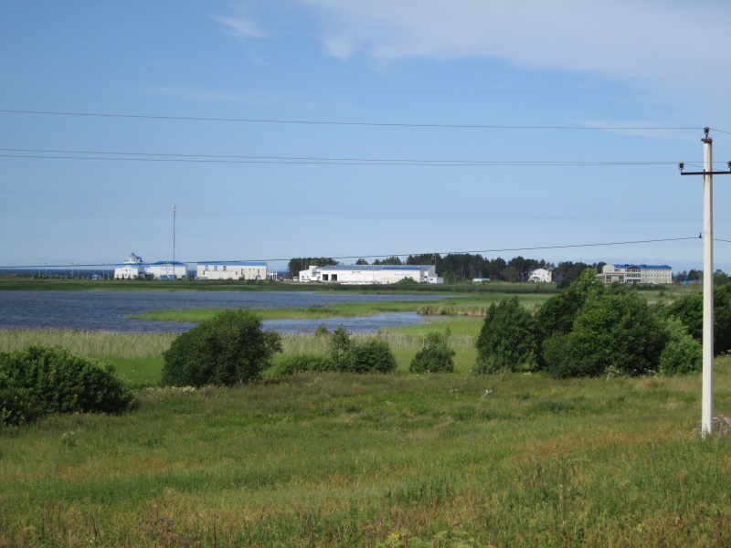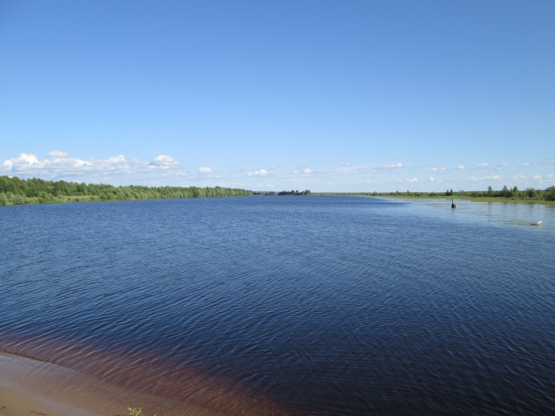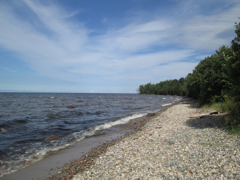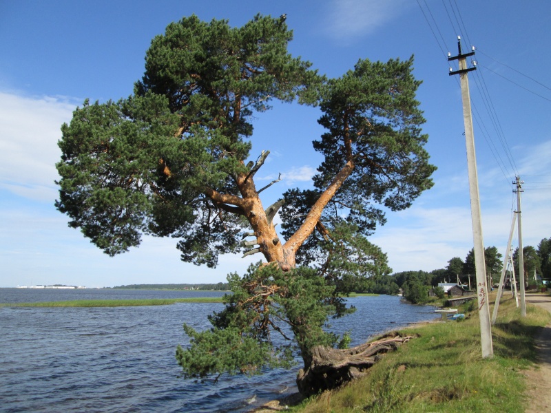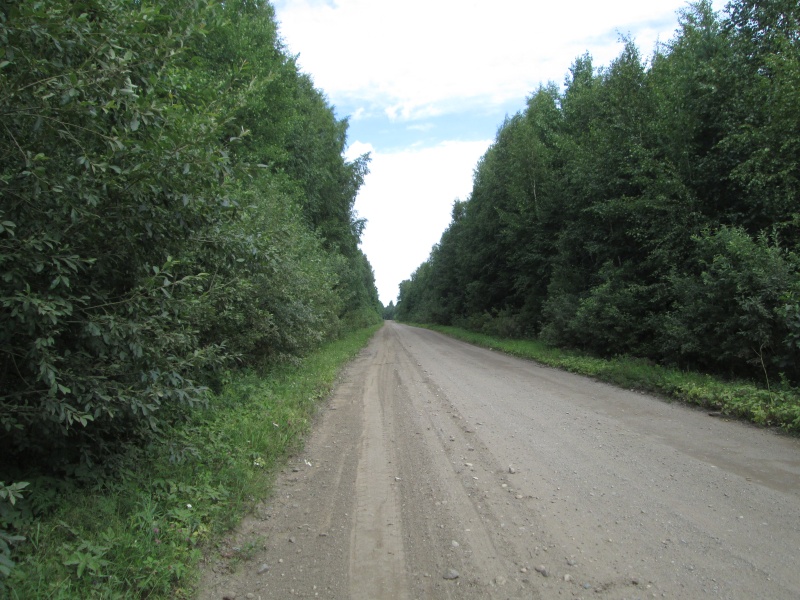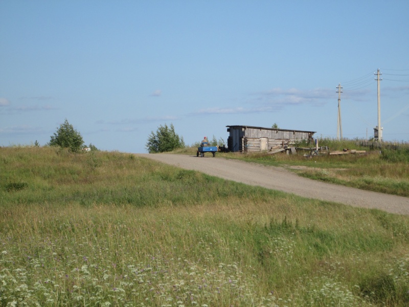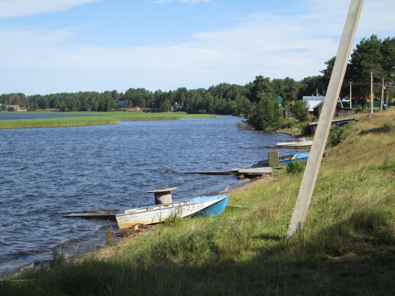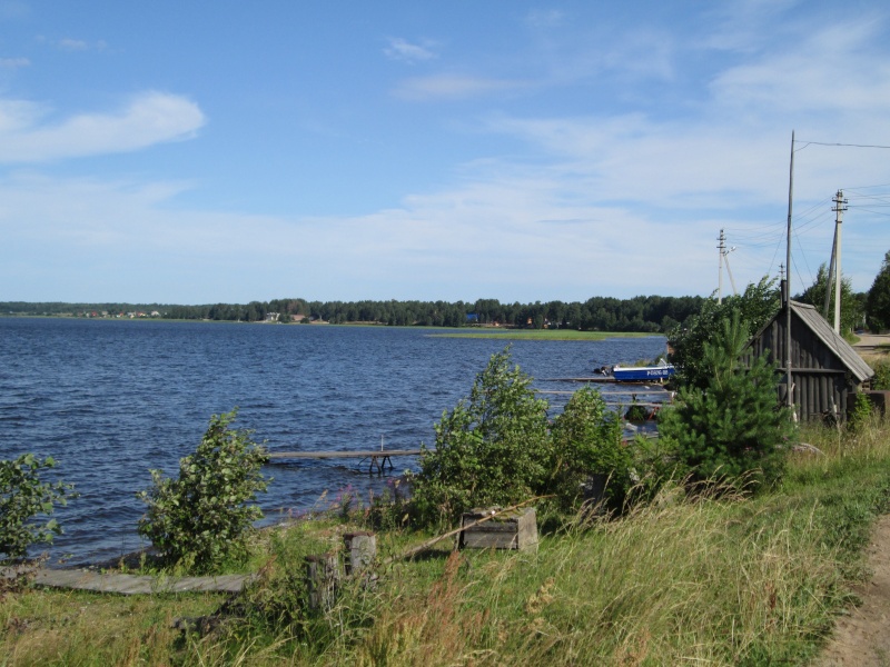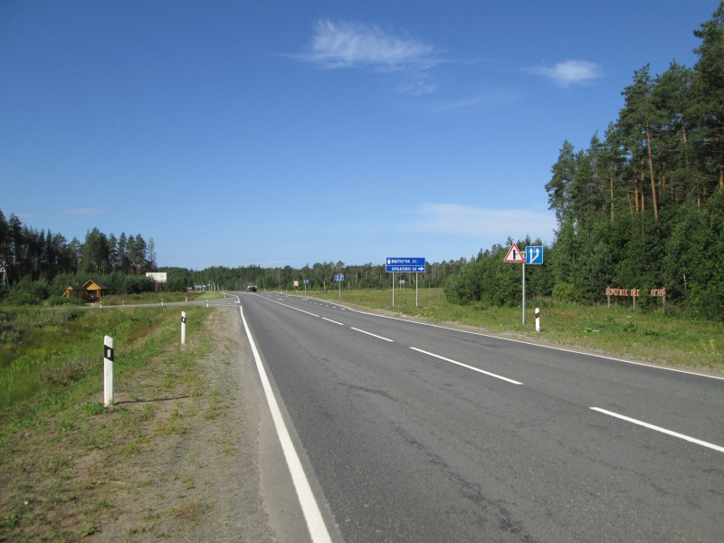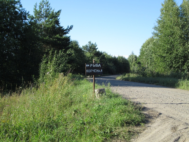 У центра МЧС заканчивается асфальт, дорога поворачивает направо и начинает виться вдоль берега Онеги. Тут я первый раз передохнул полчасика - умылся, выпил кваса, посидел. В 10:50 потопал дальше.