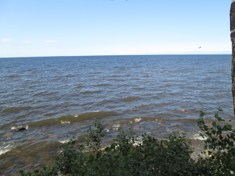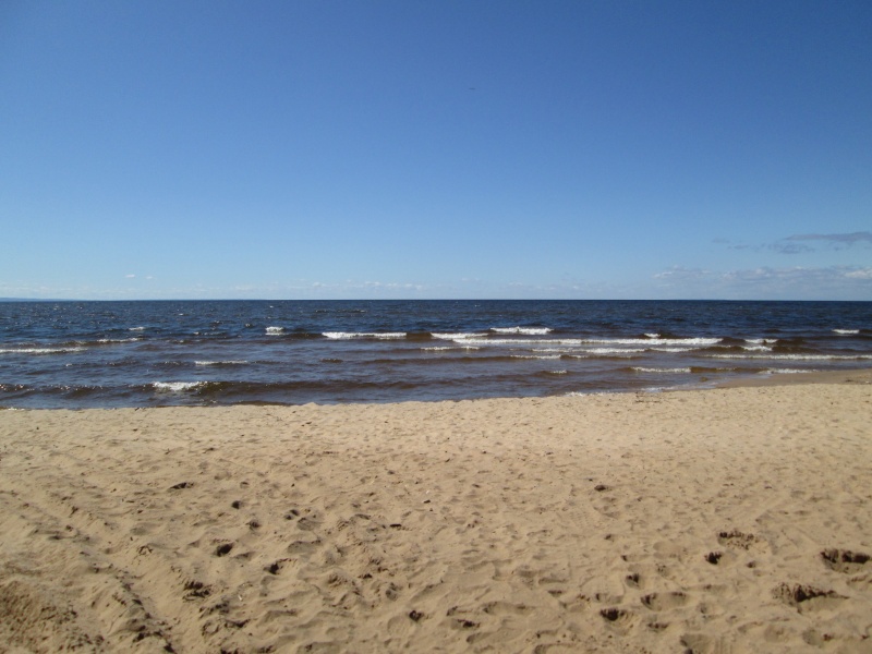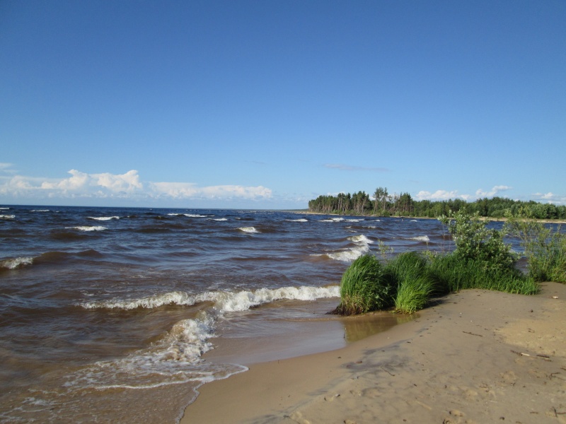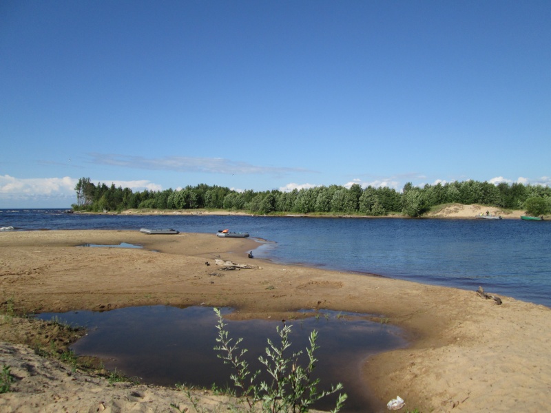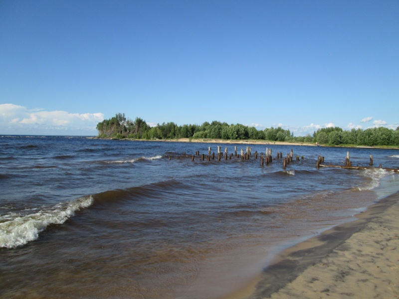 Не жарко, солнце жарит, но ветер с Онеги всё сдувает. Даже песок не горячий. С удовольствием искупался.