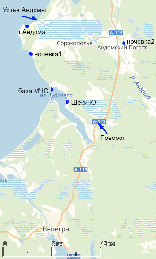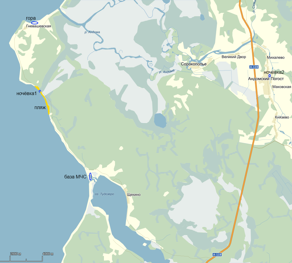 Первую ночь я ночевал на пляже, вторую - на берегу реки Андомы в Андомском погосте. Но об этом ниже.