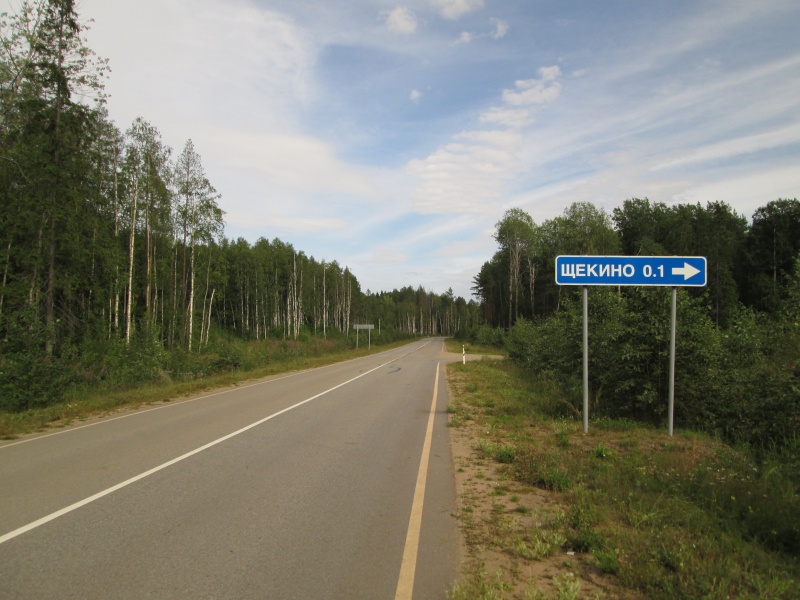 А вот и ЩекинО! Вчера я топал по объездной, сегодня пойду через деревню, ибо надо зайти в магазин за продуктами. Да и запасы жидкости в организме надо пополнить.