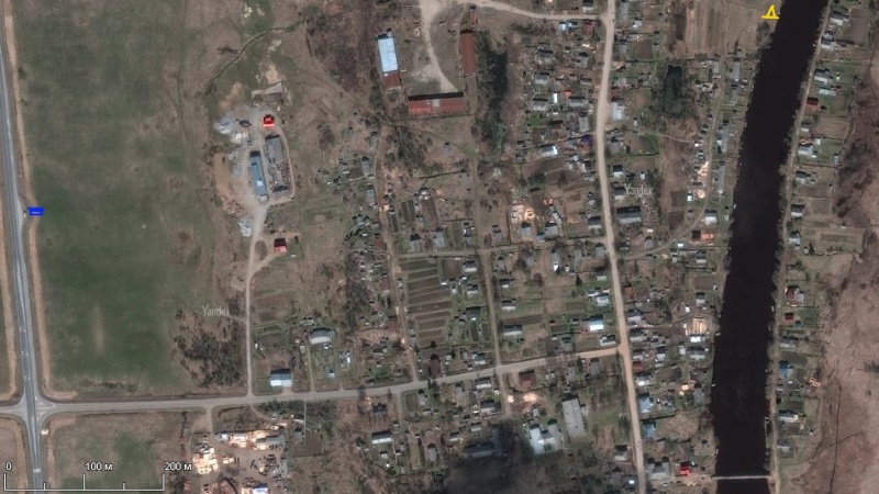 Вот спутниковый вид места с масштабом. Пририсовал где ставил свой вигвам (жёлтым) и автобусную остановку на трассе (синим).