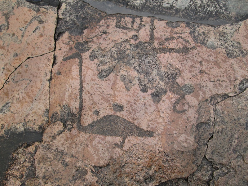 Судя по одинаковой степени сохранности человека и креста - вполне возможно что всё это выбито в одно и тоже время, а "древние петроглифы" - просто чья-то шутка.