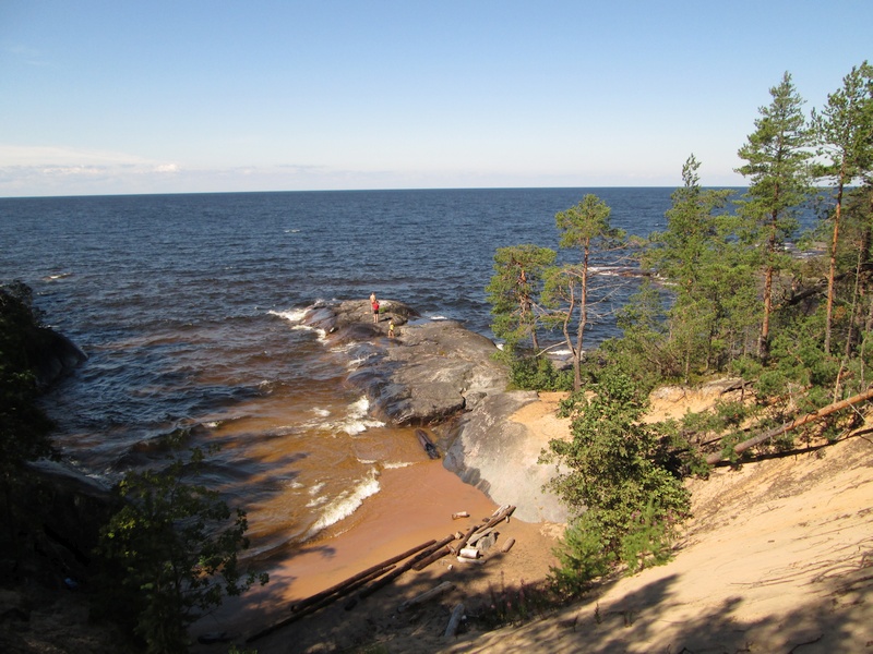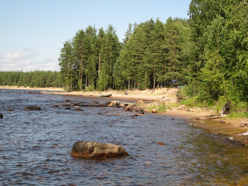 8:35 - стало жарко, пора вставать и сворачиваться. Ребята тоже сворачиваются. Онега относительно успокоилась и их "лодочник" подойдёт на катере к пляжу, а иначе пришлось бы таскать вещи к Чёрной речке.
