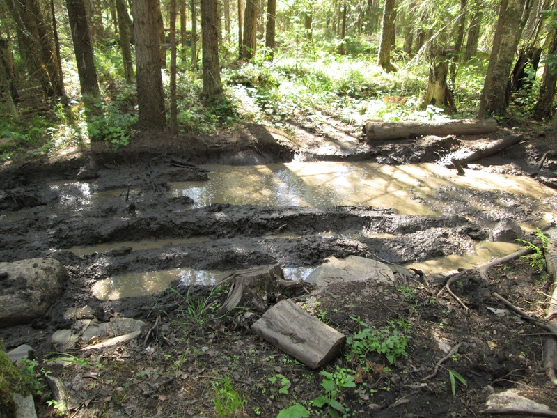 После того, как дорога взлетела вверх - она опять ныряет вниз, а там - вот такая грязища, ибо течёт ручеёк....