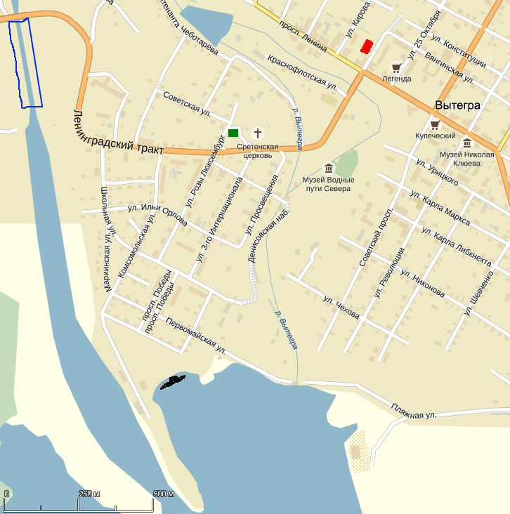 Пририсовал местонахождение гостиницы (красным), автостанции (зелёным), музея "Подводная лодка Б-440" (естественно - чёрным), и шлюза №1 (обведён синим).