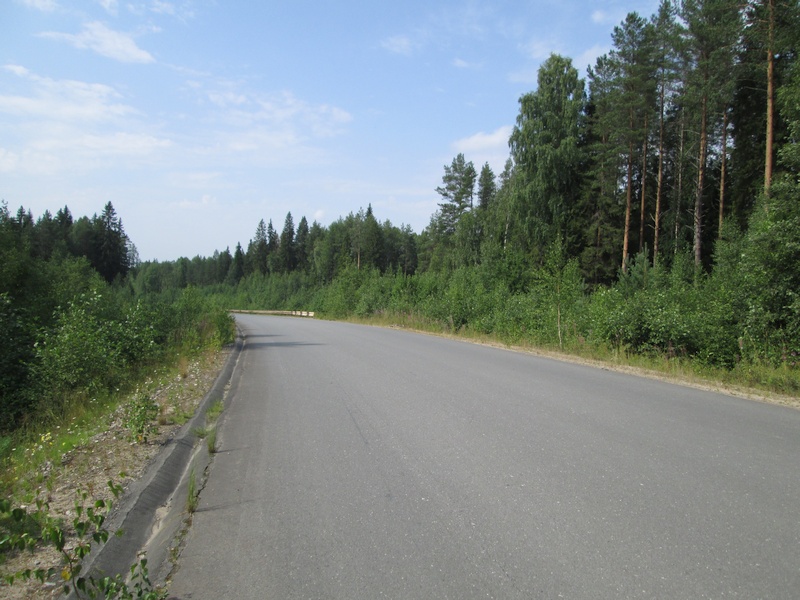 Топал долго, машин было очень мало. Один лесовоз остановился, спрашивал куда я. Зачем - я не понял. Дотопал почти до границы с Архангельской областью - и тут подобрал меня "дальнобойщик" Олег. В том смысле что человек на легковушке ехал далеко - через Каргополь, Няндому и дальше - вроде до Вельска. По дороге подобрали ещё 2 молодых ребят, которые путешествовали очень налегке. Я их уже встречал на трассе - то я их обгоню, то они меня, а вот теперь попали в одну машину.