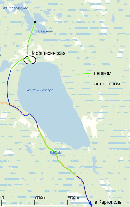 закупить чуток продуктов (на случай ночёвки), выбраться на трассу (это ещё километров семь) и двигаться в сторону Каргополя (километров 60).