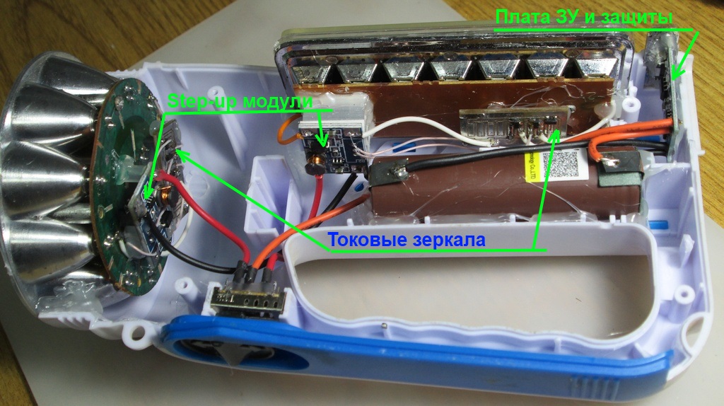 Сначала хотел сделать полностью на китайских модулях, но токовые зеркала всё равно пришлось делать и получилось много межмодульных соединений - смотрите схему NoName фонарика.