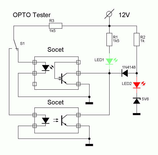 Меня напряг R11. Оказывается это для проверки специализированных оптопар 6N137 (для передачи цифровых сигналов на скоростях до 10 MBd) - желающие сами могут найти мануал на неё. Питается от 5v, естественно. Но стабилизаторы придумали трусы - подаём 12v через R11 и OK!! На схеме, правда, совсем не понятно куда подаётся напряжение через R11 - ибо нарисована простая транзисторная оптопара... Но присобачили R11 к ней креативно!