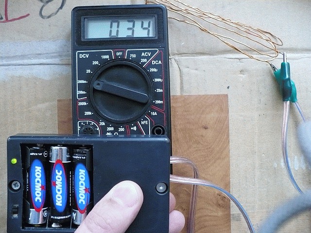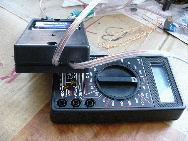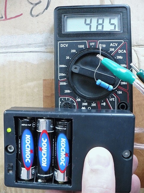 Приставка к цифровому "китайскому" мультиметру. Диапазон 1 миллиОм - 1,999 Ома. Естественно - четырёхпроводная схема измерения. Измерительный ток - 20 mA. Усиление УПТ - 50. УПТ - на прецизионном ОУ с подстройкой нуля OPA227. Предел, устанавливаемый на мультиметре - 2v. Плату не привожу, т.к. были задумки обойтись без кнопки - не получилось :-( Схема в sPlan. Настройка --------- Для начала надо измерить ток стабилизатора на DA1, при этом резистор R5 должен отсутствовать. Если ток менее 20мА, то добавляем в схему R5, расчитанный по формуле: R5=(IR2)/(20-I), где I - измерянный ток, а 20 - это нужный нам. Если ток более 20mA - надо увеличить R2 и повторить процедуру. Да, когда будете измерять ток, узнайте соротивление шунта в вашем приборе, а то если VD1 откроется - все ваши измерения будут полной лажей. Хотя можно обозвать это инновацией! :-) Это уже на ваш вкус.... Я пробовал измерять двумя приборами (после добавки R5) на пределе 200mA: KT30B показал 20,1mA падение на шунте было ~83mV (т.е. шунт ~4 Ома), а MS8264 показал 20,0mA при падении на своём шунте ~155mV (т.е. шунт ~8 Ом). Если в вашем приборе шунт 10 Ом, то VD1 скорее всего уже начнёт приоткрываться, придётся его выпаять, чтоб не мешал. Далее соединяете измерительные щупы (у меня мини-крокодильчики на конце), нажимаете кнопку и крутите подстроечник R11 до тех пор, пока на мультиметре не увидите 000,0 (лучше переключить на предел 200mV). С отпущенной кнопкой будет показывать минус несколько единиц (у меня, например, -4 на пределе 2v) - не обращайте внимания. Т.к. стабилизация выходного напряжения в преобразователе напряжения осуществляется по каналу "+", то при выключении стабилизатора тока напряжение в канале "-" несколько меняется (у меня на 0,3v). Вариант - изменение схемы питания. "Крона" - стабилизатор +5v и инвертор, например ICL7660, делающий -5v из +5v. Преобразователь напряжения - схема из журнала "Радио" №10-2005, также можно посмотреть №11-2003. ![]() Внешний непрезентабельный вид... Зато дёшево и сердито работает! ![]() Выходные клеммы сделаны из раскручивающейся сетевой вилки. Причём расстояние между штеккерами равно расстоянию между входными гнёздами на мультиметре, а они иногда разнятся на разных приборах, ибо китай китаю рознь! Делайте под свой.... ![]() Измеряем сопротивление куска провода. ![]() Резистор 0,47 Ома. |