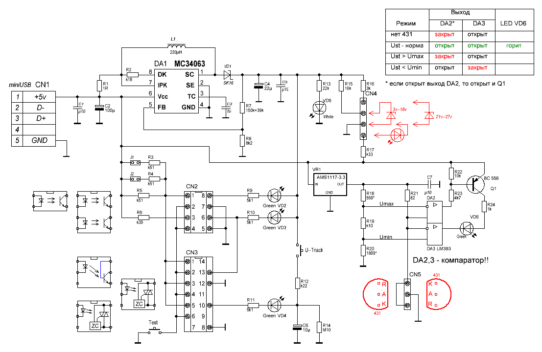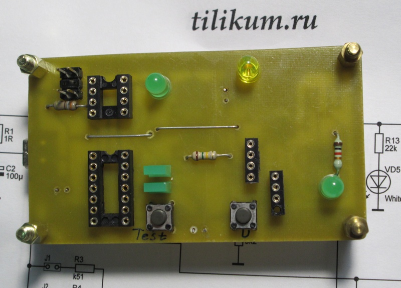 1. Жмём Тест, держим, потом жмём U-Triack - должен загореться светодиод VD4. Отпускаем Тест - светодиод должен продолжать гореть. Отпускаем U-Triack - светодиод гаснет.