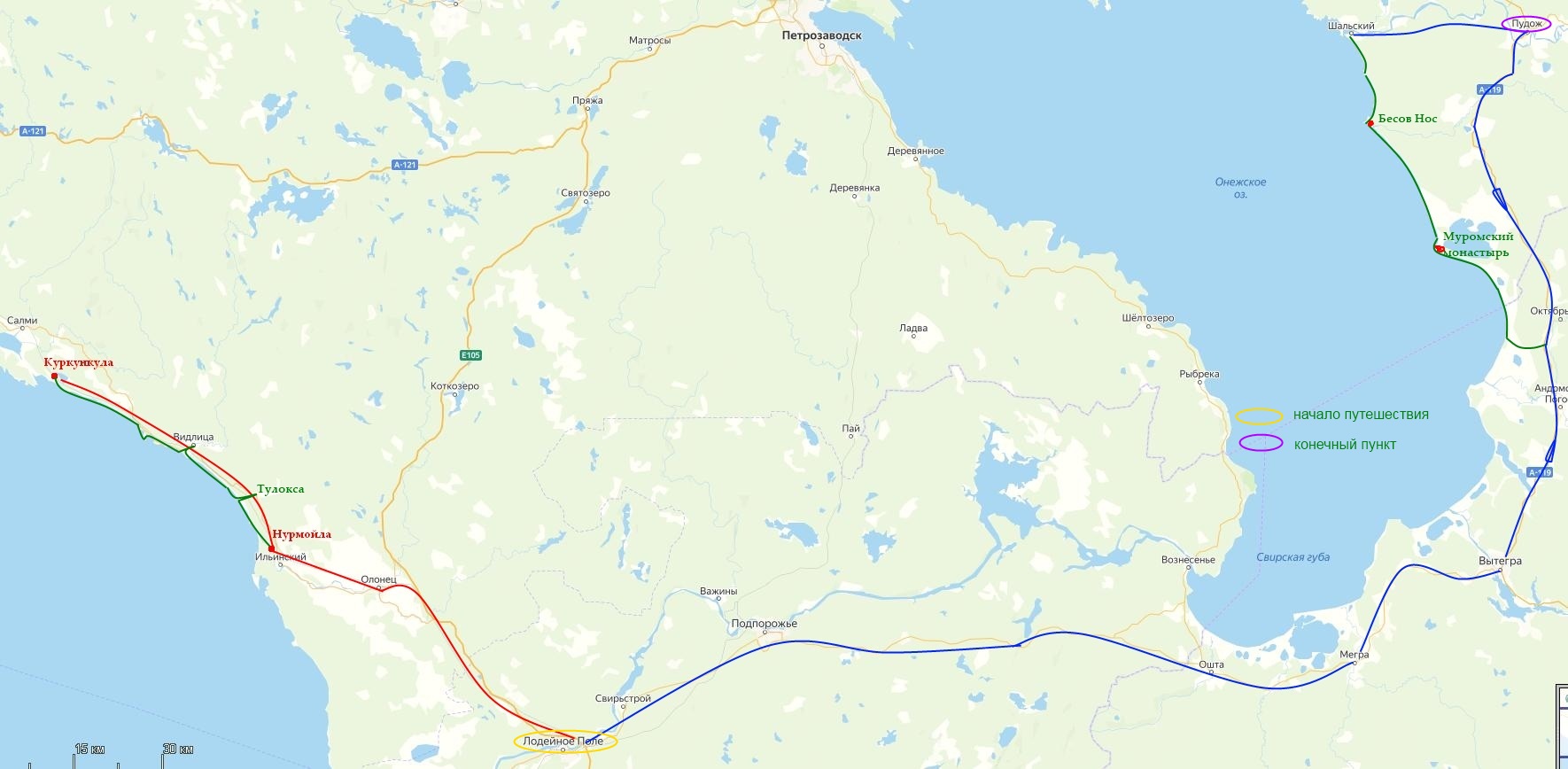 Поехать, например, на Онегу на недельку - это потратить там 4-5 тысяч (ночёвки в Вытегре и Пудоже + питание на месте и в походе) и при этом на проезд, по прошлогодним прикидкам, нужно 12-14 тысяч, а в этом году будет явно немного больше. Какие-то неадекватные пропорции.... Значит надо удлиннять отпуск. Городки в той округе я уже все видел, да и не тянет уже по городам, отдохнуть от них надо. Поэтому к Онеге прибавляем Ладогу, притом расширяем предыдущий маршрут - и получаем:
